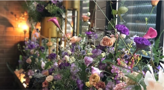 一流ホテルのシェフをご自宅に呼び、立食形式でのパーティーをご提案。通常、ホテルに行かないと味わえない食事体験を、お客様のご自宅で提供。プロの手によるフラワーアレンジメントでリビングを装飾し、喜寿のテーマカラー「紫」を使った上品な空間演出を行った。