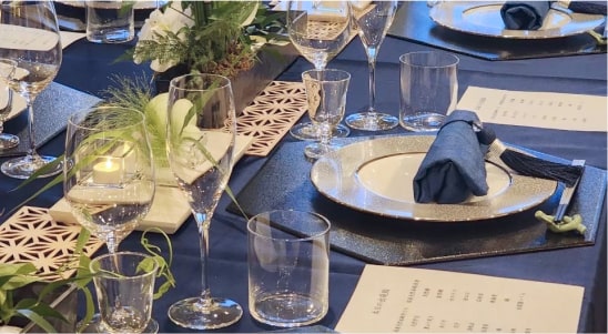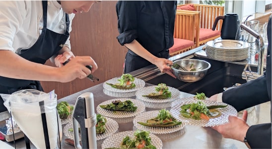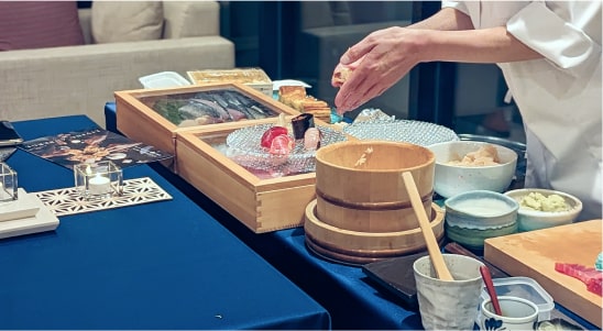 お昼は出張料理人によるフレンチのコース、夜は名店で修業を積んだ寿司職人による出張寿司ディナーをご提供。洋風、和風それぞれの雰囲気にマッチした空間演出も行うことで、普段と全く違う雰囲気で食事を楽しむことができ、住民同士のコミュニケーションが活性化された。